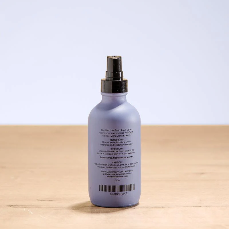 Enhance the atmosphere of your home with the Nest Sea Foam Room Spray. This refreshing spray features uplifting notes of ylang ylang and neroli, creating a fresh and invigorating scent. Handmade in South Africa.